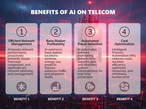 Infographic of top benefits of using AI in telecommunications