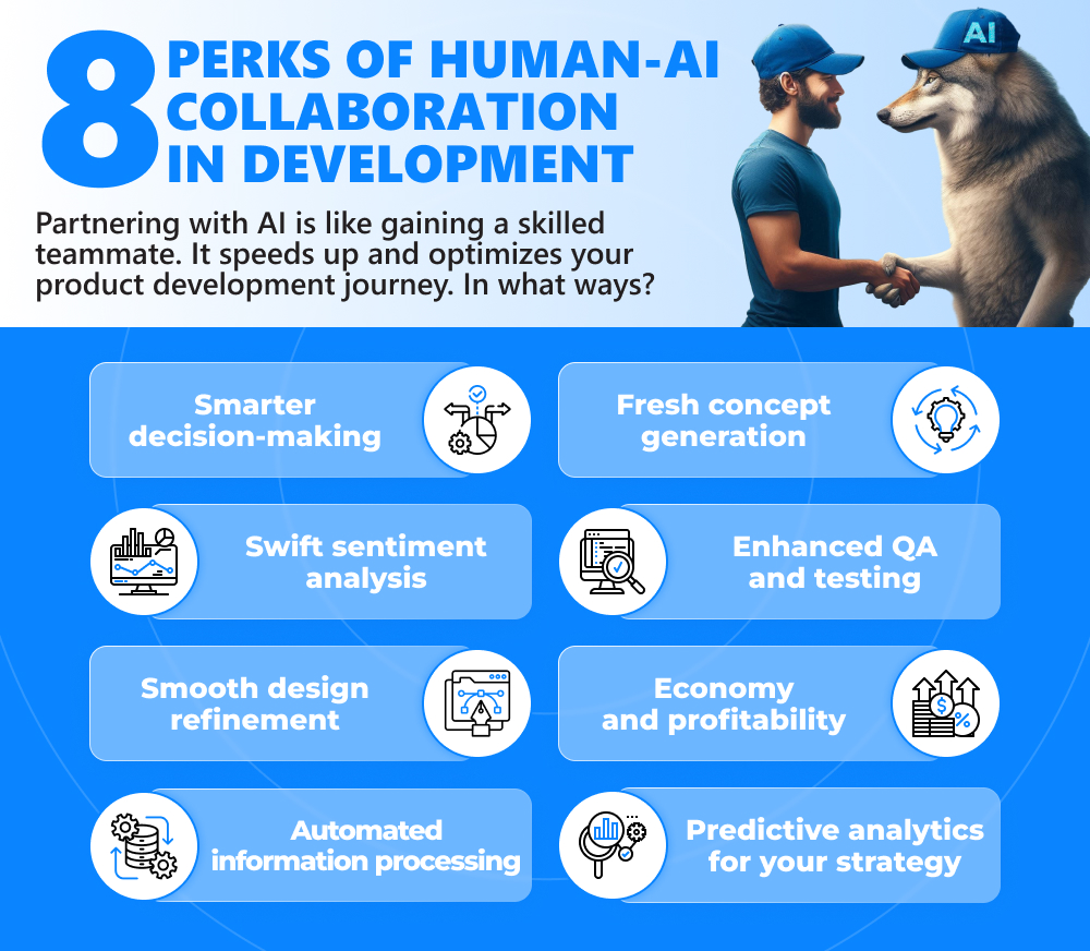 When you choose to collaborate with AI, it opens the door for your new coworker to prove its worth. Take it as a sidekick who doesn't work alone, but rather amplifies your product development efforts.