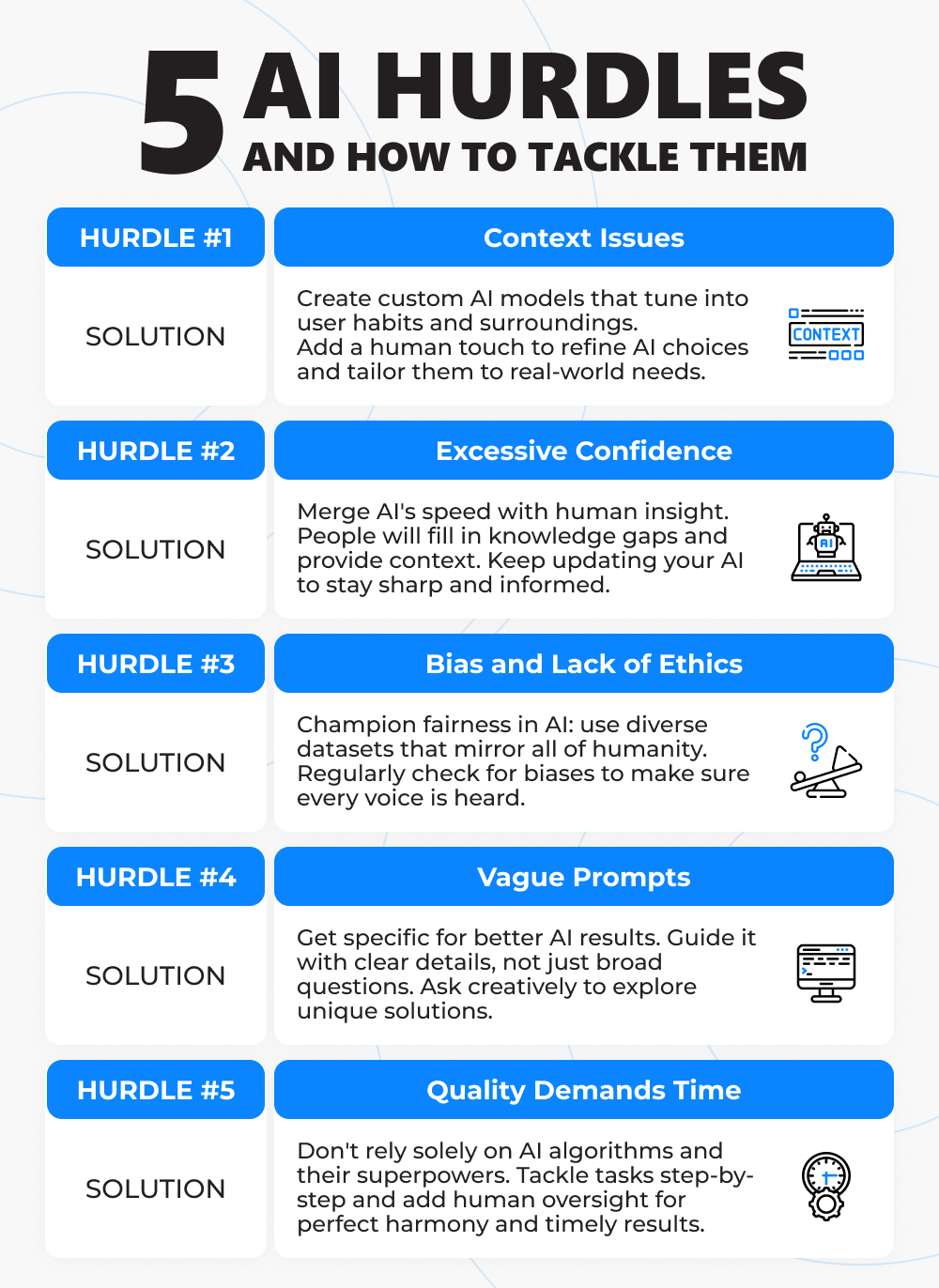 Missed deadlines? Don't rely solely on AI algorithms and their superpowers. Recognize their boundaries. To succeed, break tasks into manageable steps so the machine can handle them sequentially. Spice up the process with human oversight. It won't be an obstacle to the entire process, but a push for a balanced outcome.