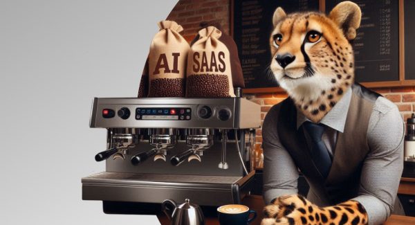 Cheetah barista stands next to two coffee bean bags that represent AI SaaS.