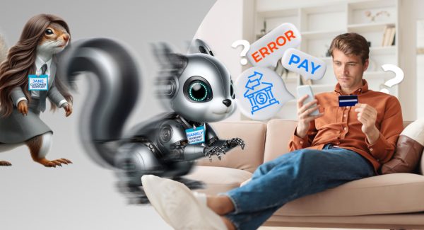 Man sitting on couch trying to use mobile banking, squirrel-customer support specialist rushes to his aid, but it is overtaken by squirrel-chatbot
