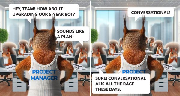 Squirrel-project manager standing in front of its colleagues suggesting them to upgrade their 5-year chatbot with brand-new conversational AI