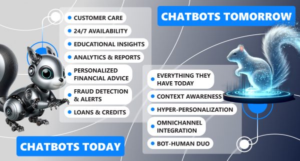 Infographics of key traits of today's and tomorrow's banking chatbots with digital squirrels