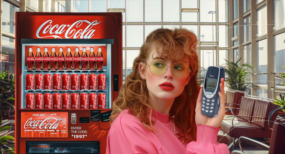 young woman in glasses with red curly hair and blue eyes hold cell phone to enter code written on coca-cola vending machine at helsinki airport to demonstrate first use case of electronic payments