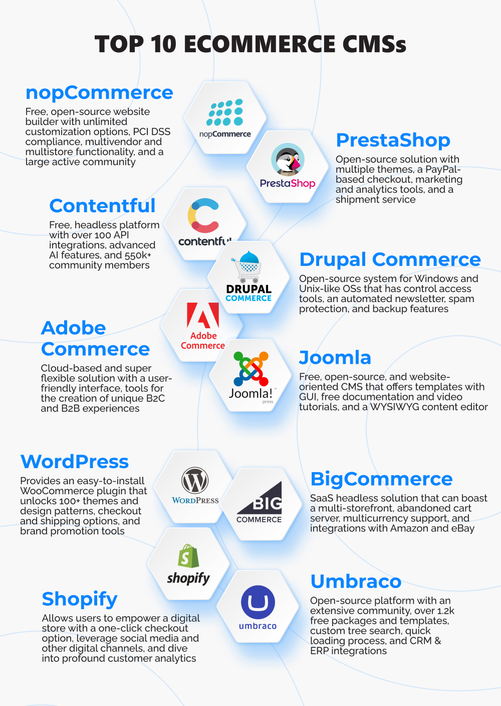 Umbraco, WordPress/ WooCommerce, PrestaShop, Strapi, Drupal, Joomla, Magento Open Source, nopCommerce