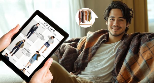 man with dark hair sit on sofa smiling and dreaming about autumn clothes and see online store built with ecommerce cms and relevant offers