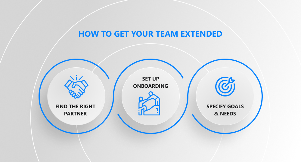 Yes, the extended team model mostly presupposes remote work, but it doesn't mean you should ignore the onboarding process. Remember, the ETM is about a long-lasting partnership, so your goal is to help remote developers get on the same page with your team ASAP. What's more, don't forget to set up a working environment so that everyone feels a positive vibe and drive.
