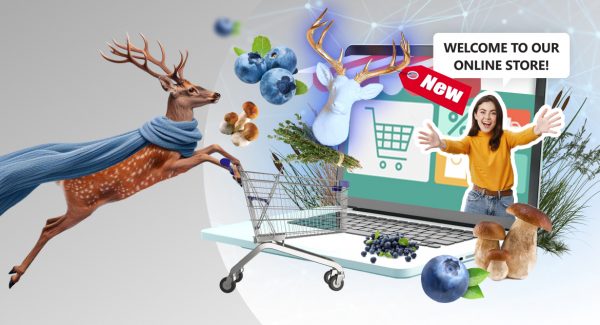 deer in blue scarf with shopping cart rush towards online store full of berries mushrooms grass antlers where girl with dark hair in yellow sweater greet buyers and show how to use generative ai in ecommerce