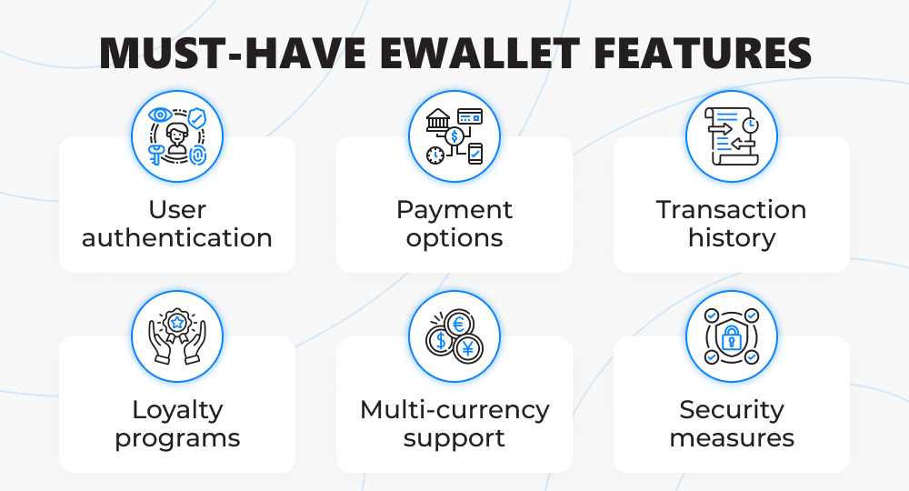 - Define major digital wallet features. The majority of e-wallet solutions follow a standard feature set. Still, there are core functionalities essential to the success of any platform. These include: