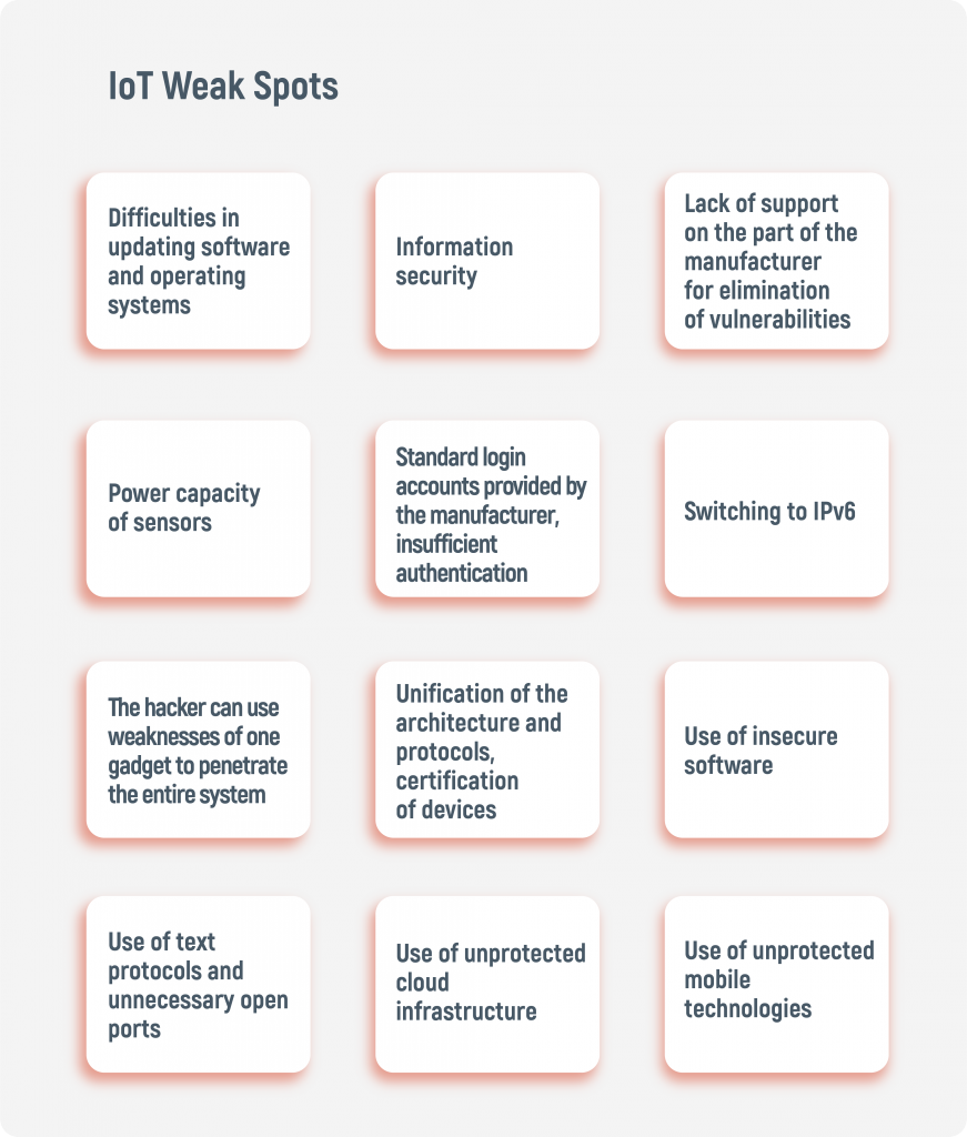 For Internet of Things devices, security consists first of all in the code integrity, user (device) authentication, checking user rights as well as the possibility to withstand virtual and physical attacks. However, as the case may be, most of the IoT devices currently in use are not provided with security features, they have management interfaces accessible from the outside, default passwords, i. e. they have all the characteristics of web vulnerability.
