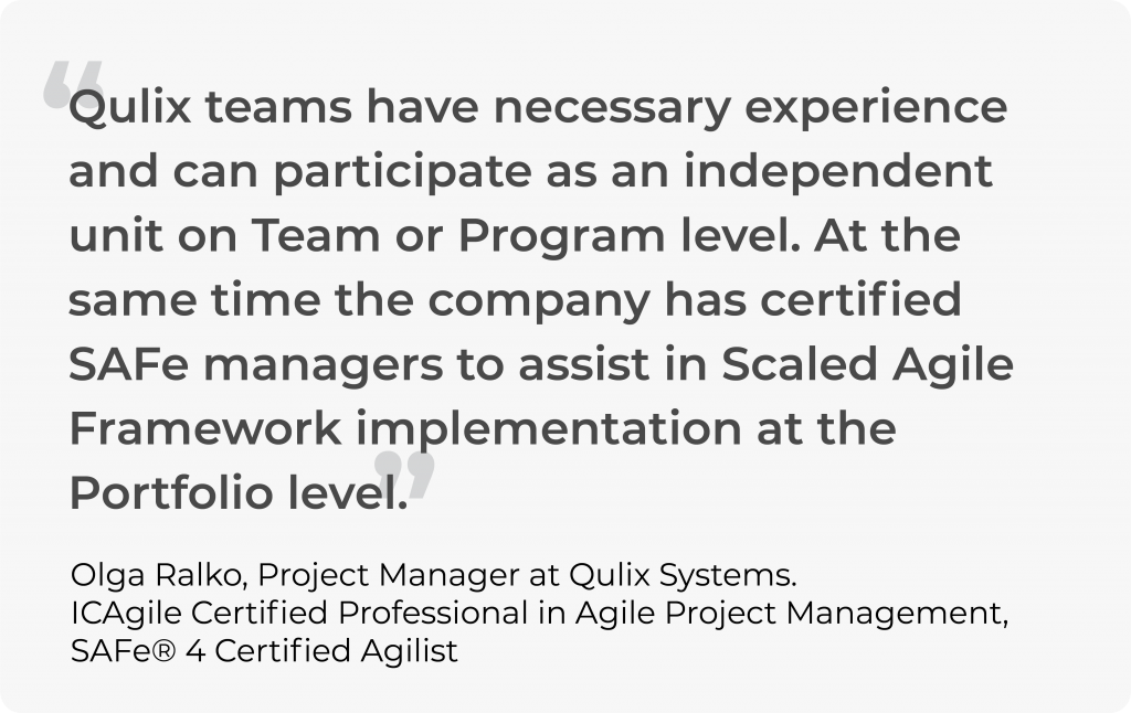 With the inspiration for successful SAFe implementation cases at HP, IBM, Philips, and other popular companies, Qulix initiated adapting core SAFe value in a couple of major projects mostly in the area of banking and financial product development.