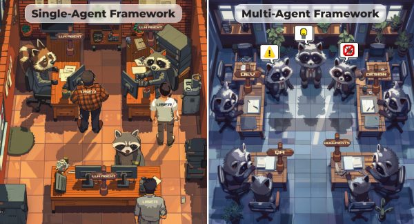 Infographic of single and multi-agent LLM frameworks with raccoons working with users and processing their requests