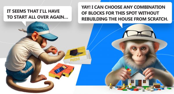 monkey in blue shorts white t shirt and blue cap solve cube jigsaw puzzle that resemble monolithic systems while monkey in while monkey in hat and glasses play with lego blocks that remind of microservices architetural style
