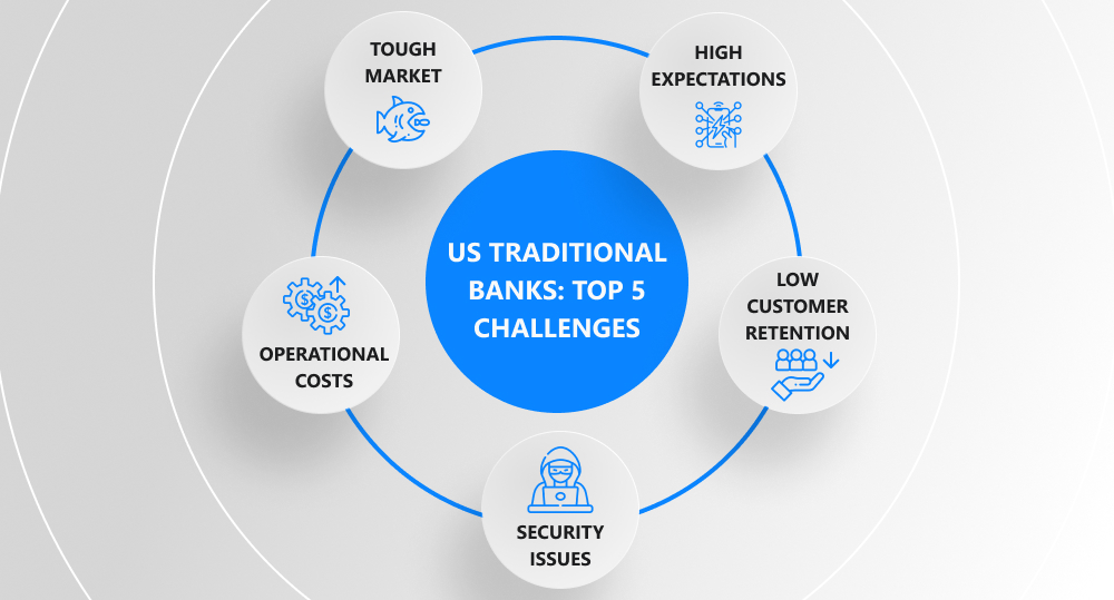 One of the most burning issues today is the increase of the federal funds rate (FFR) target up to 3–3.25%. Although such measures are supposed to combat record-high inflation and lots of investors set positive expectations for the US stock market, financial institutions and bank customers are facing a harsh reality. Hopefully, this situation won't last long. But the bad news is that it's not the only challenge most banks have to address now. So, what are the others?