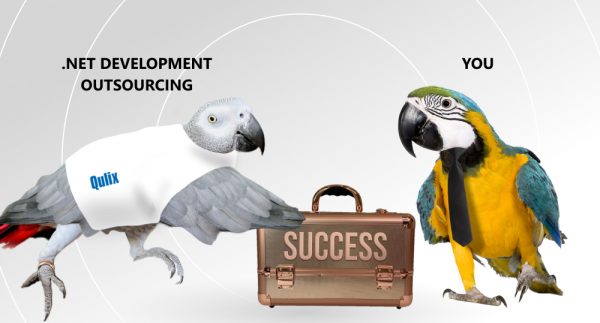 Parrot on the left is standing in T-shirt with Qulix logo, he pushes suitcase with his wing to parrot in tie on the right. Inscription next to the parrot on left is .Net Development Outsourcing, on right it says You, and inscription on suitcase is Success.