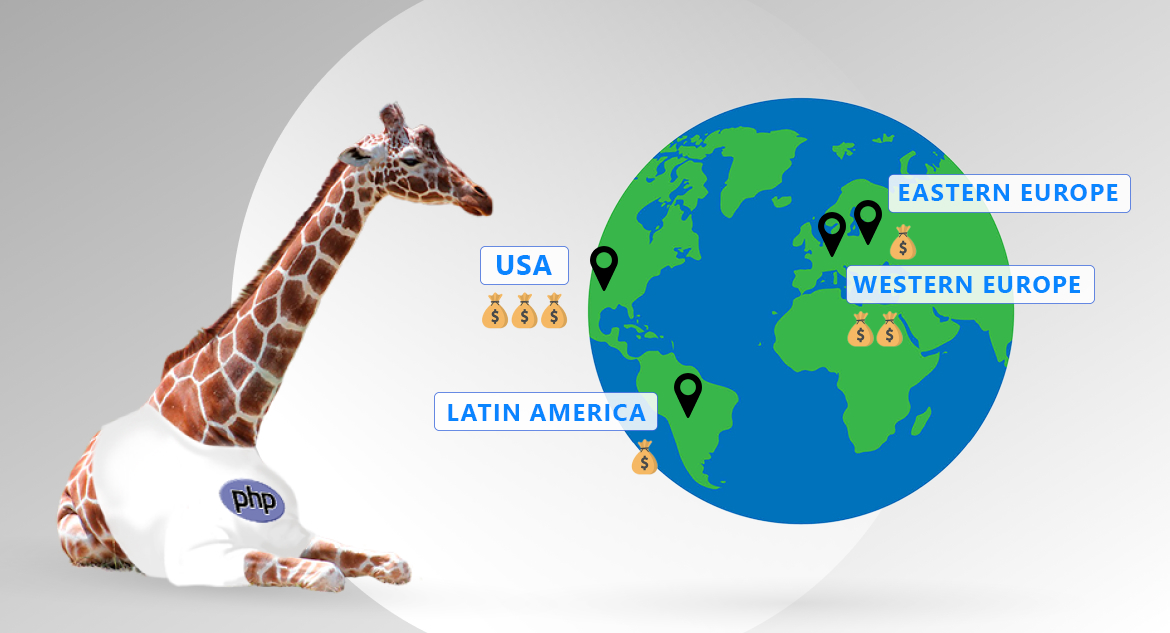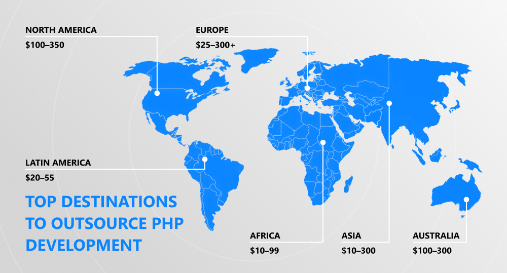 The average hourly rate for an offshore developer with PHP expertise is $32–45 per hour. However, rates can vary depending on numerous factors, including experience, location, and project requirements. Let's look at this issue in terms of the location of a PHP outsourcing company.