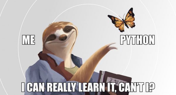 Sloth with open mouth looks at butterfly and wonders if he can learn Python.