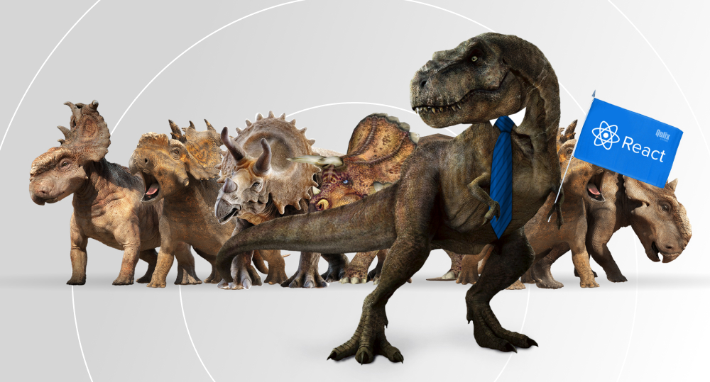 Crowd of dinosaurs stands with flag that has Qulix and React written on it.