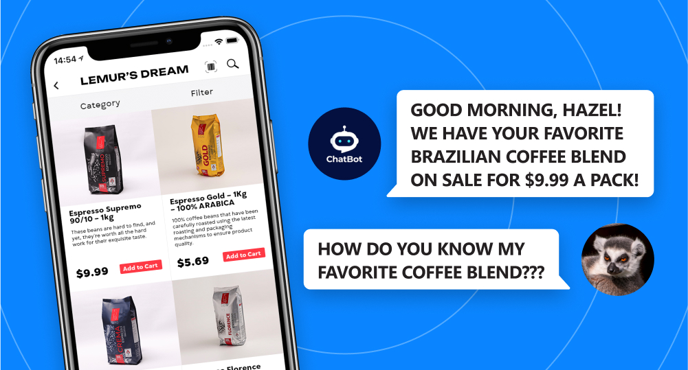 Hazel chatting with a sales chatbot, chatbot offering to buy her favorite coffee blend