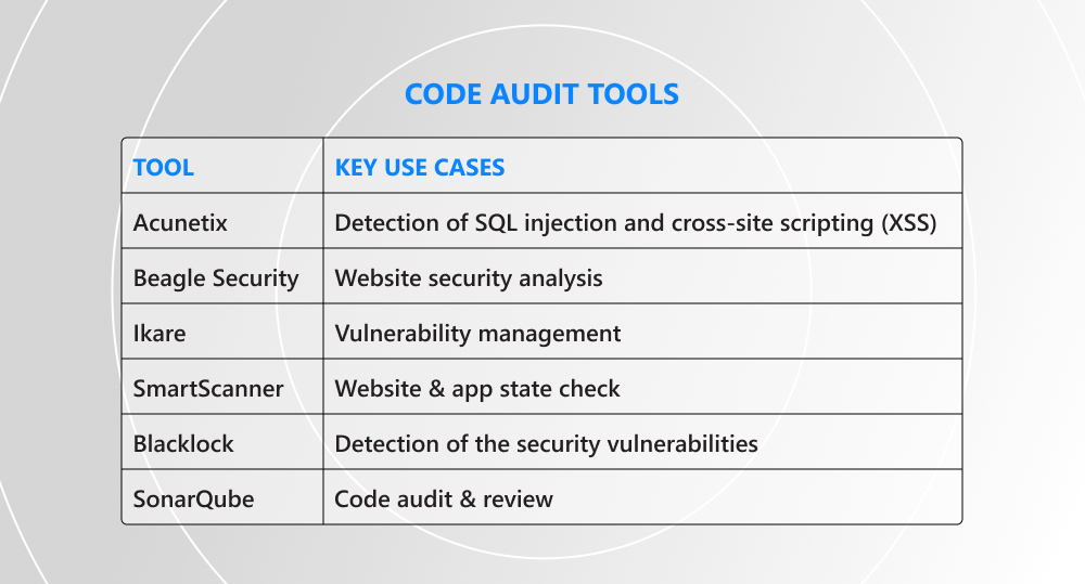 When performing an automated code audit, reliable, time-tested tools are a must. And among the most popular you may find Acunetix (for detecting SQL injection or cross-site scripting (XSS)), Beagle Security (for website security analysis), Ikare (for vulnerability management), SmartScanner (for the website & app state check), and Blacklock (for revealing the security vulnerabilities).