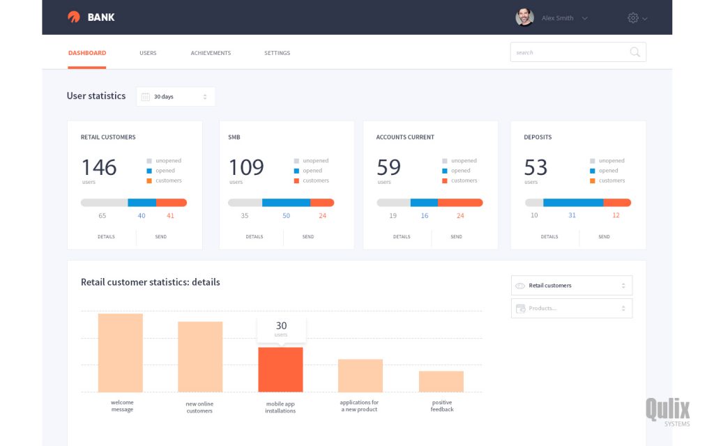 For bank’s managers, it looks like a dashboard with the list of recent user actions, statistics and adjustable planning of personal interaction programs.