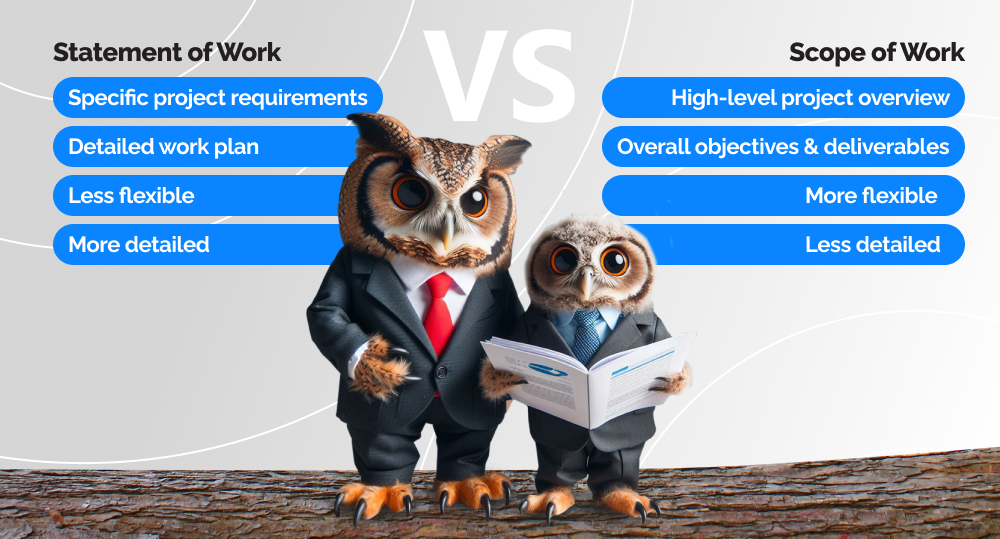The two terms are used in project management, and both are necessary when communicating project details to a software development company. Although the statement of work and the scope of work are closely related, they differ in their focus: