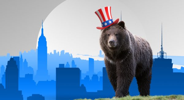 Bear wearing a hat with an American flag pattern standing in front of famous American buildings and presenting the top software houses in the USA