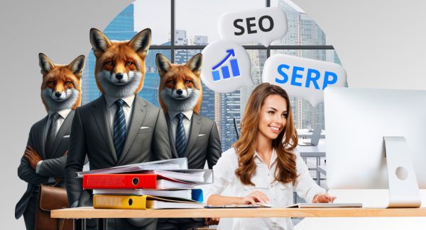Happy girl working at her computer, optimizing her website with Umbraco SEO, three foxes in formal suits looking confidently in the future