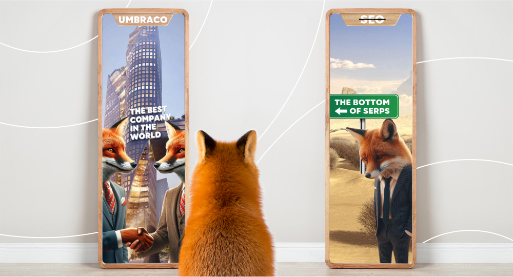 Fox sitting in front of two mirrors showing its ideal and poor life