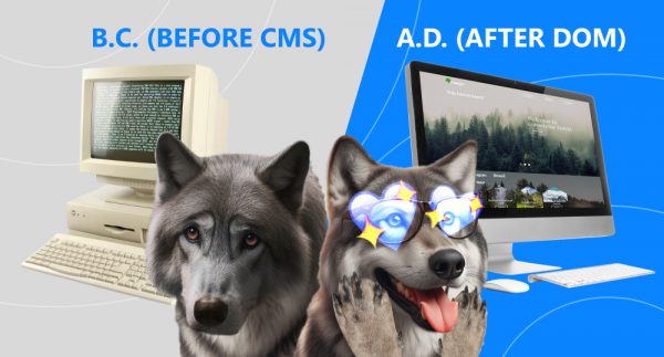 sad wolf look at old computer screen with text and happy wolf look at modern computer screen and see website built with content management system CMS