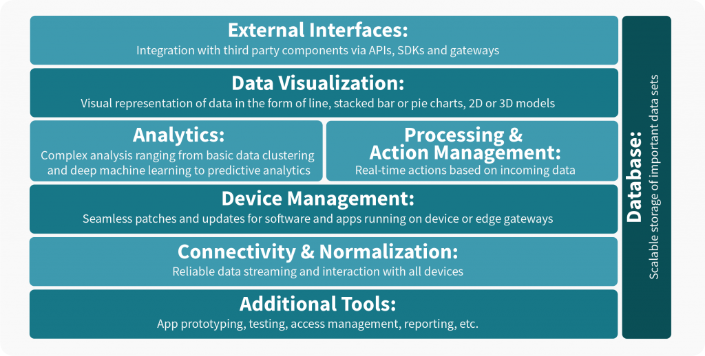 Modularity is of high importance during the implementation of an IoT solution since it ensures quick deployment of an IoT platform in order to meet specific business requirements. For example, your IoT Platform may follow the concept of modules – logical and operational parts with their own functional roles.