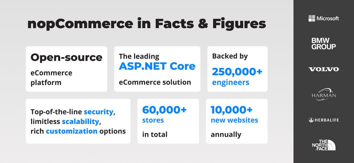 nopCommerce is an open-source eCommerce platform. It is based on the ASP.NET Core framework by Microsoft and is identified as the leading ASP.NET Core eCommerce solution. The platform is backed by a vast professional community (250,000+ engineers) and stands out among other eCommerce vendors due to top-of-the-line security, limitless scalability, and rich customization options. NopCommerce has helped more than 60,000 online retail businesses to launch their stores. From SMBs to large-scale enterprises, 10,000+ new websites go live every year. The list of nopCommerce’s clients includes companies like Microsoft, the BMW Group, Volvo, Harman, Herbalife, and the North Face.