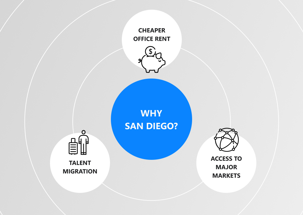 Economic factors and life quality do matter, and at this point, San Diego can beat San Francisco and San Jose by offering comfortable living conditions and lower overheads. Also, it's rapidly developing software markets, cultural diversity, and cheaper office space that attract startups (especially in the pre-funding stage) to this marvelous city.