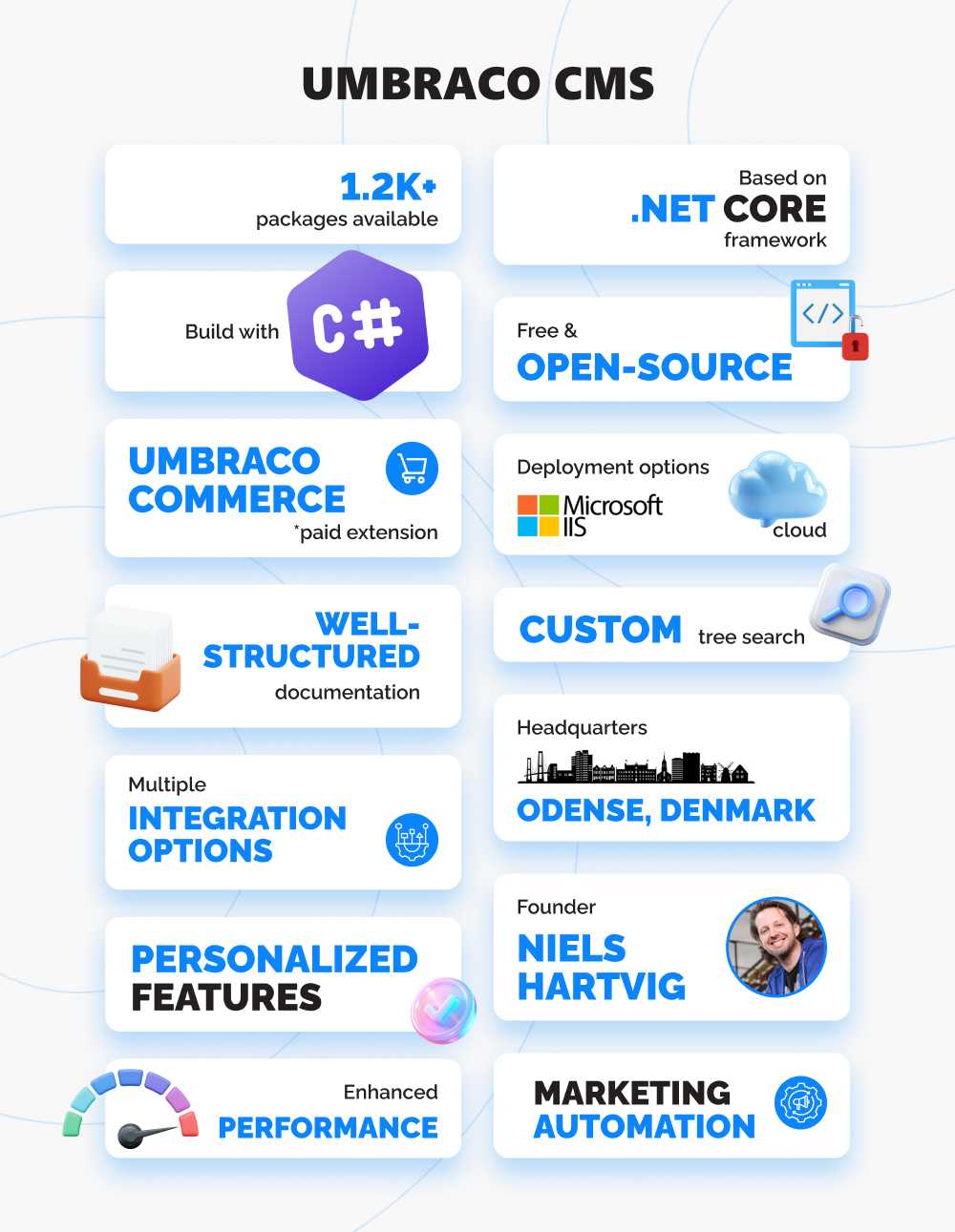 Being the icing on the cake on our rating list, Umbraco can be truly called the best CMS for an ecommerce website. Created with C# and .NET Core framework, the platform is deployed on a Microsoft IIS server or in a cloud (Azure, AWS). Although Umbraco is open-source and free by itself, Umbraco Commerce is its paid extension. The platform is user-oriented and provides detailed documentation so that anyone can easily put Umbraco through its paces. The list of its competitive edges embraces over 1.2k free packages and templates, marketing automation features, custom tree search, quick loading process even for high-traffic websites, and smooth integration with web analytics tools, CRM & ERP platforms, payment systems, and social media.