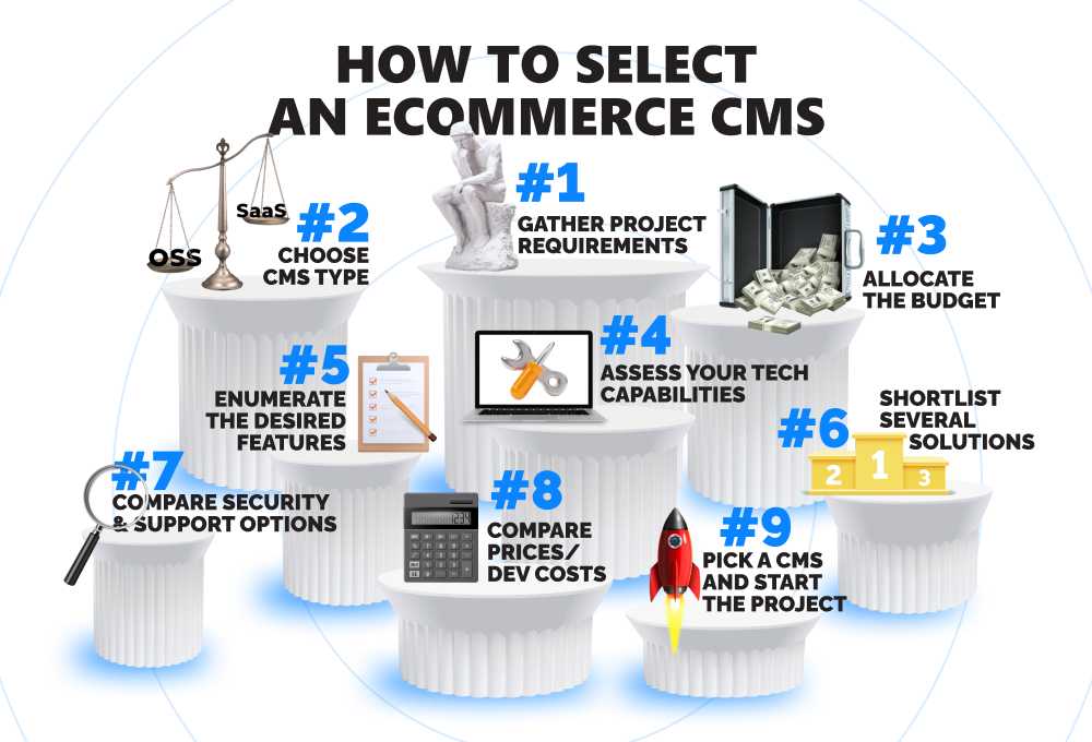 Each ecommerce CMS is good at one point or another and provides a whole bunch of content and marketing tools. To save starting entrepreneurs from racking their brains, we have created a step-by-step guide on how to select a perfect match for an eCommerce business.