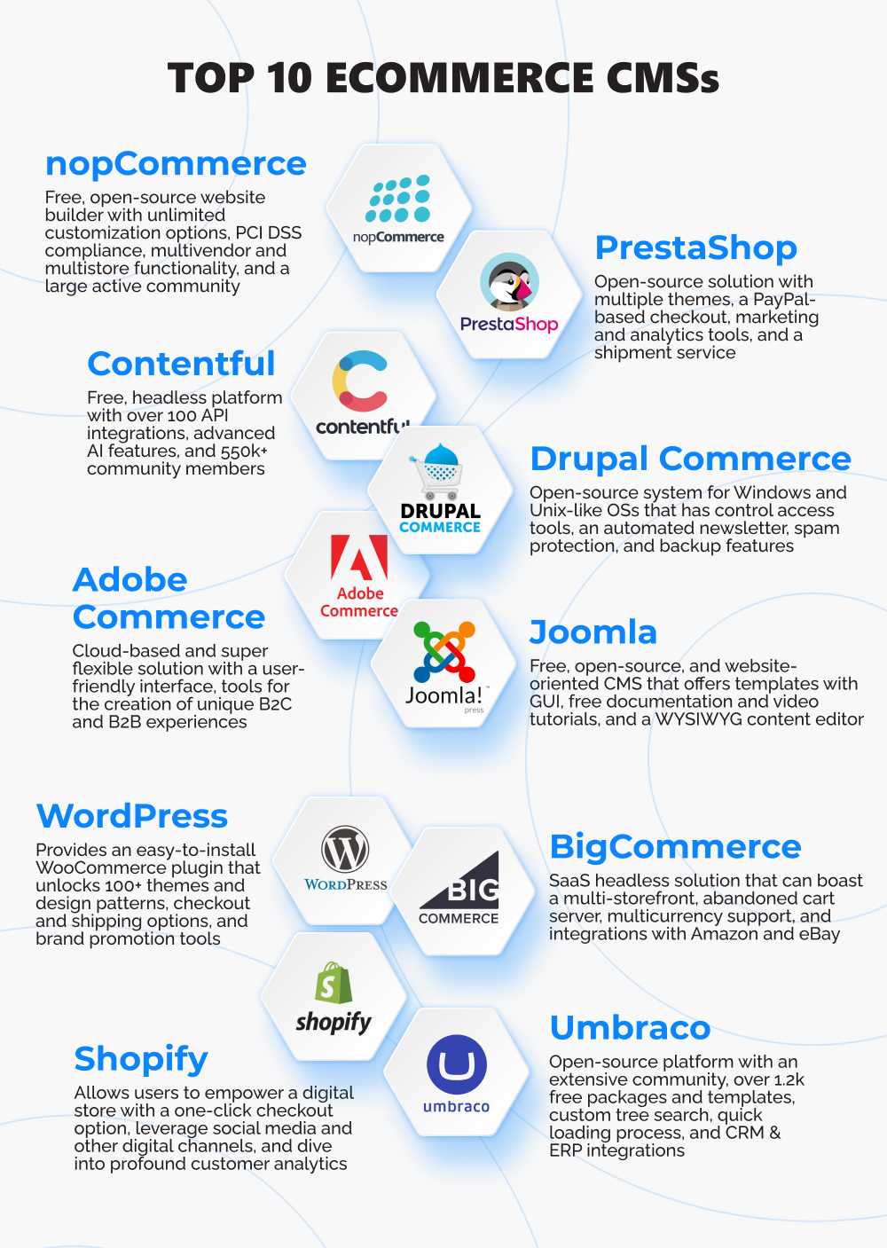But what are ecommerce CMS systems? These are even more advanced solutions that join conventional CMSs together with the selling features of an ecommerce platform. By integrating such tools into their business model, online stores can boost digital presence, drive organic traffic more effectively, and build customer loyalty.