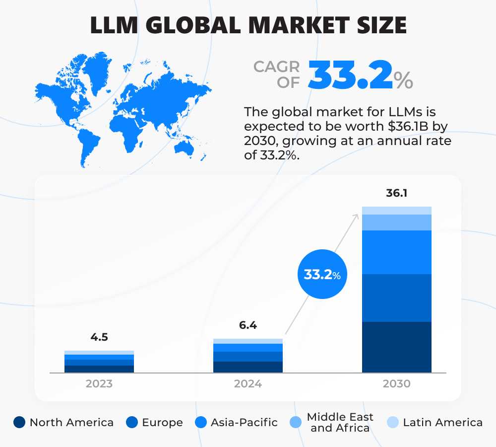 The LLM sector is witnessing steady growth. Industry analyses forecast a promising future for this technology. A study by MarketsAndMarkets indicates a significant increase in the market value: from $6.4B in 2024 to an impressive $36.1B by 2030. This translates to an extraordinary CAGR of 33.2% over the forecast period. What a huge potential for investment in AI agents, don't you think?