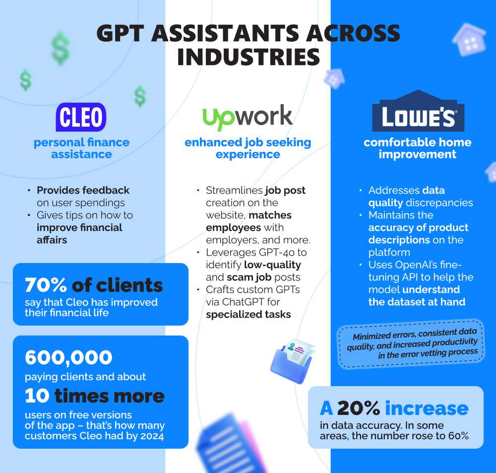 Combined, these two advantages of GPT assistants make them perfect for anything related to interactions with humans and personalized customer experiences. Hence, many business fields use these virtual helpers to elevate client support and boost efficiency.