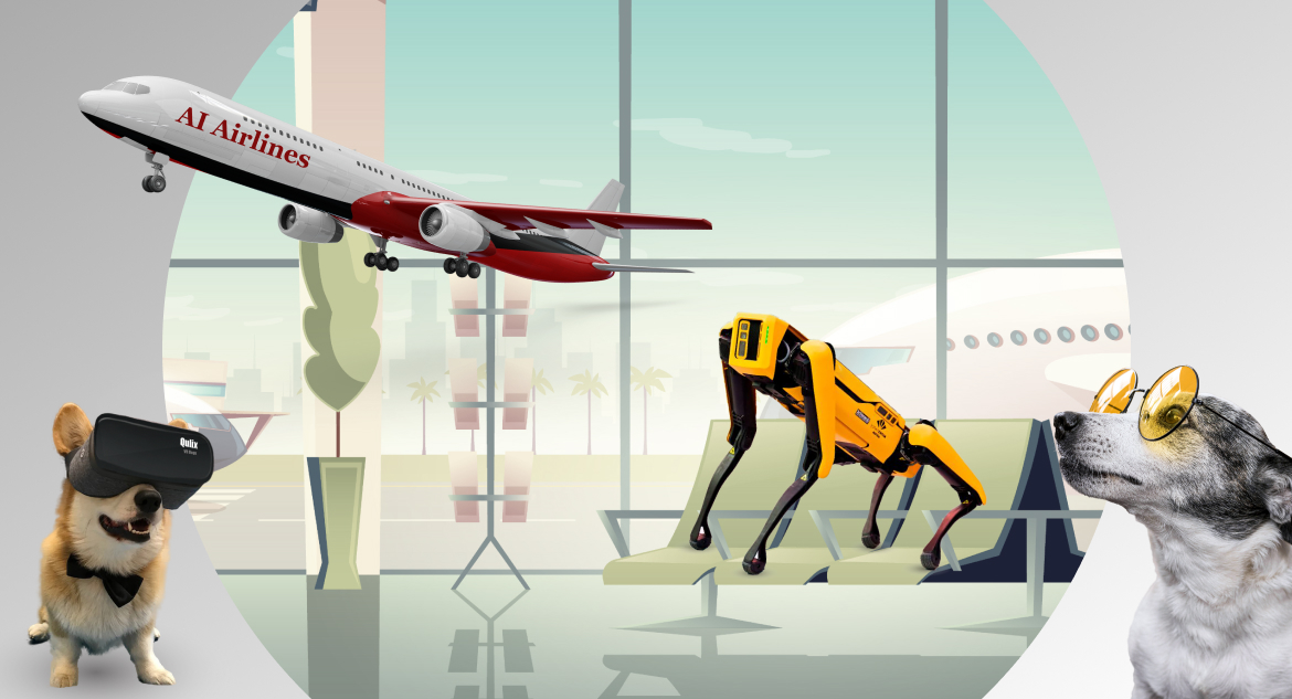 Concierge dog holding key, behind it is self-service kiosk with chatbot dog illustrating use of AI in hospitality, with a few tourists with suitcases in background
