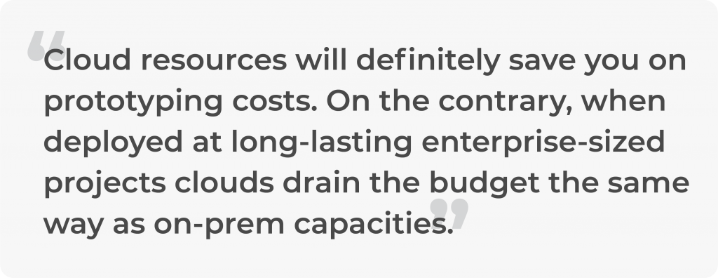 According to Sergey Pupkevich, Head of Java Solutions Department at Qulix Systems, cloud resources will definitely save you on prototyping costs. On the contrary, when deployed at long-lasting enterprise-sized projects clouds drain the budget the same way as on-prem capacities.