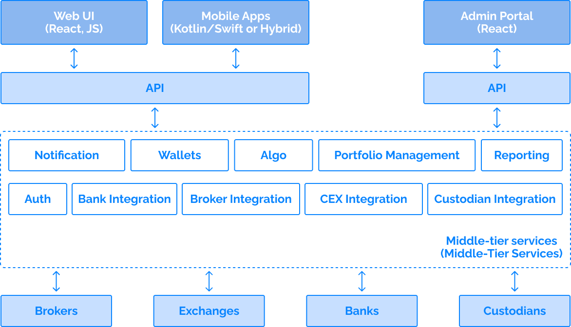 Access comprehensive portfolio management tools and innovative algorithmic trading options with our platform, designed to deliver excellence. Built on a microservices architecture, it comprises the core components and technical services. All complemented by a vast array of functional extensions.